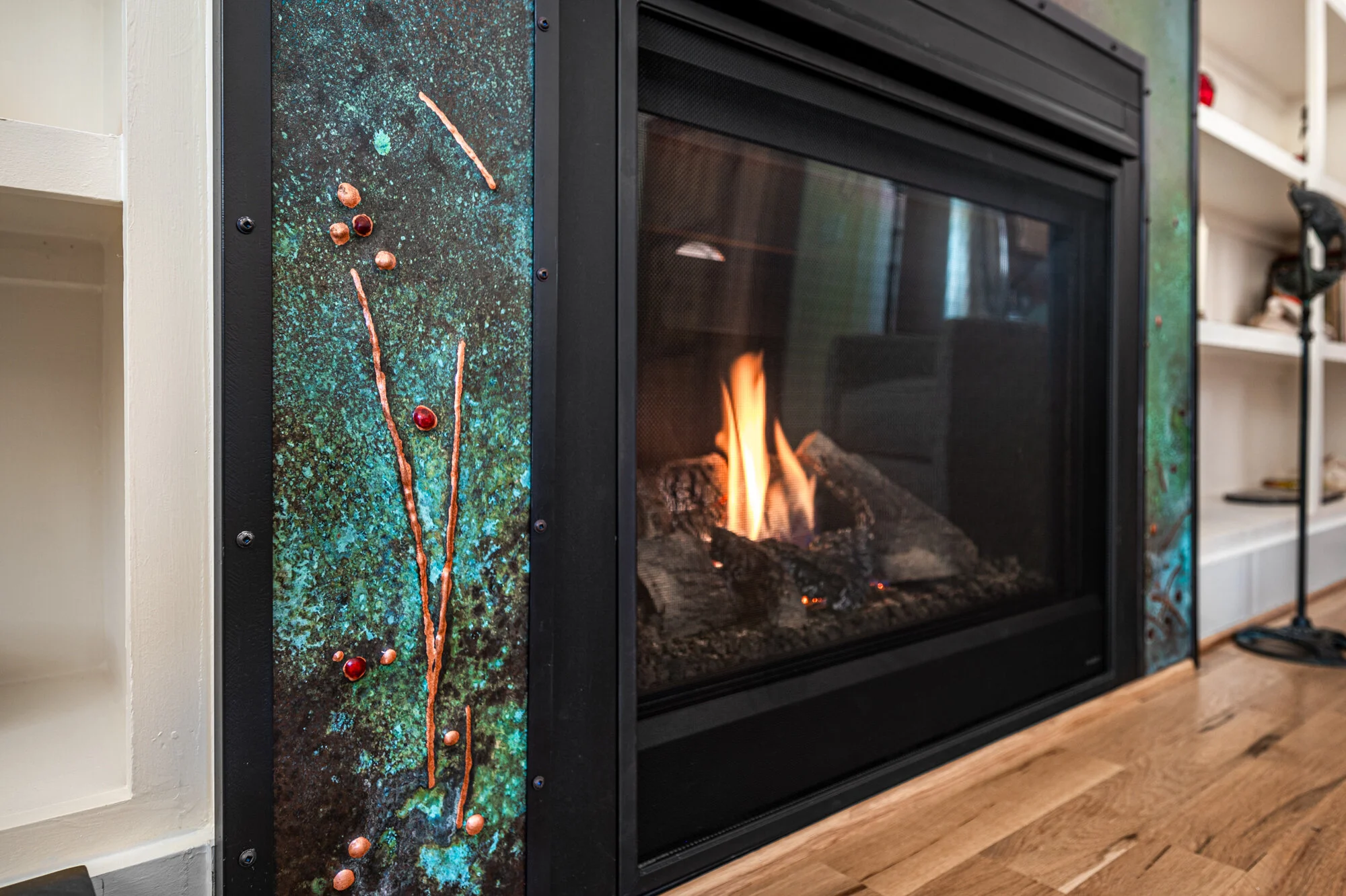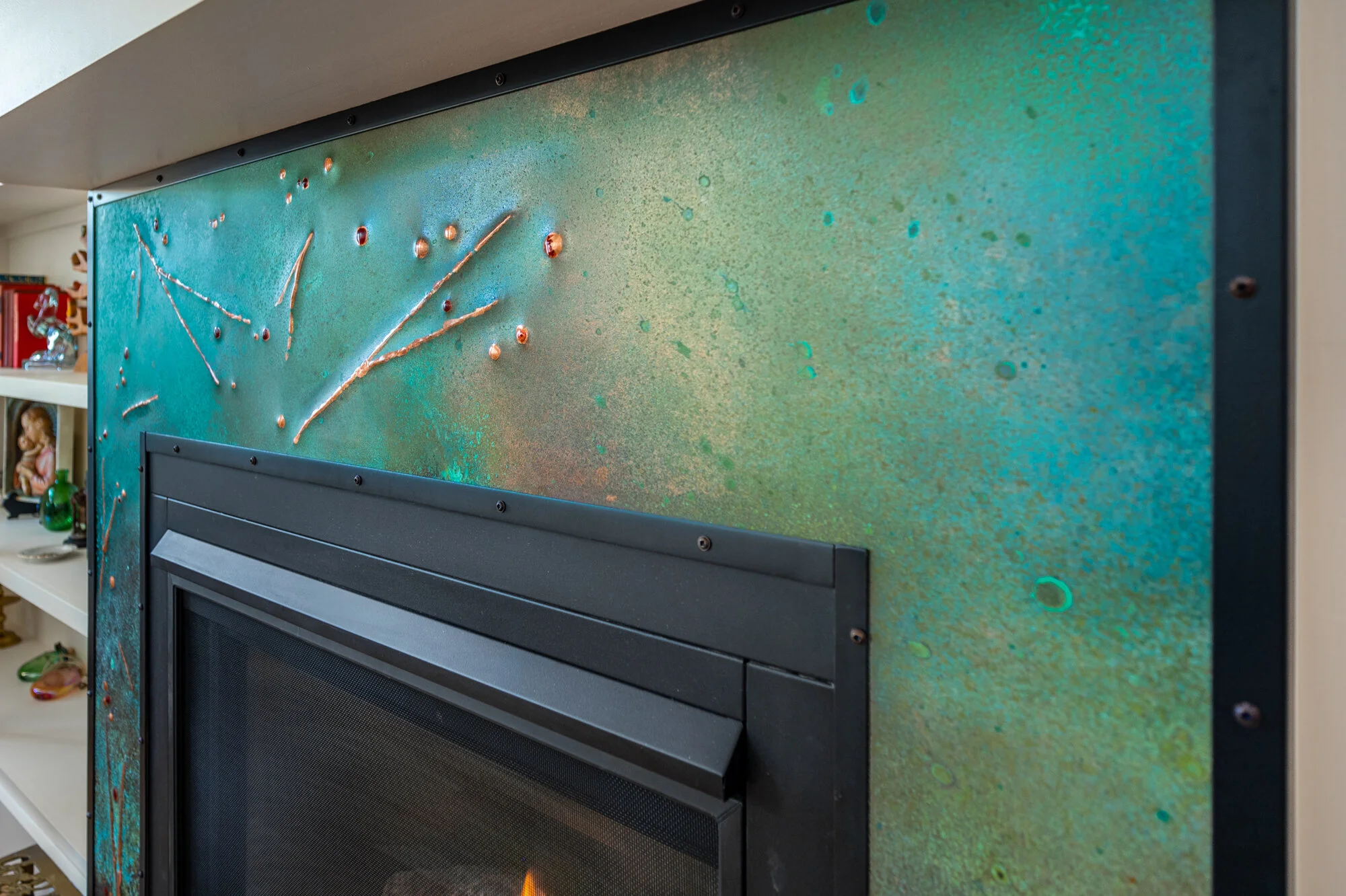 The copper fireplace incorporates embossed textural details in addition to a variety of hot and cold patinas that were applied for color and style.
