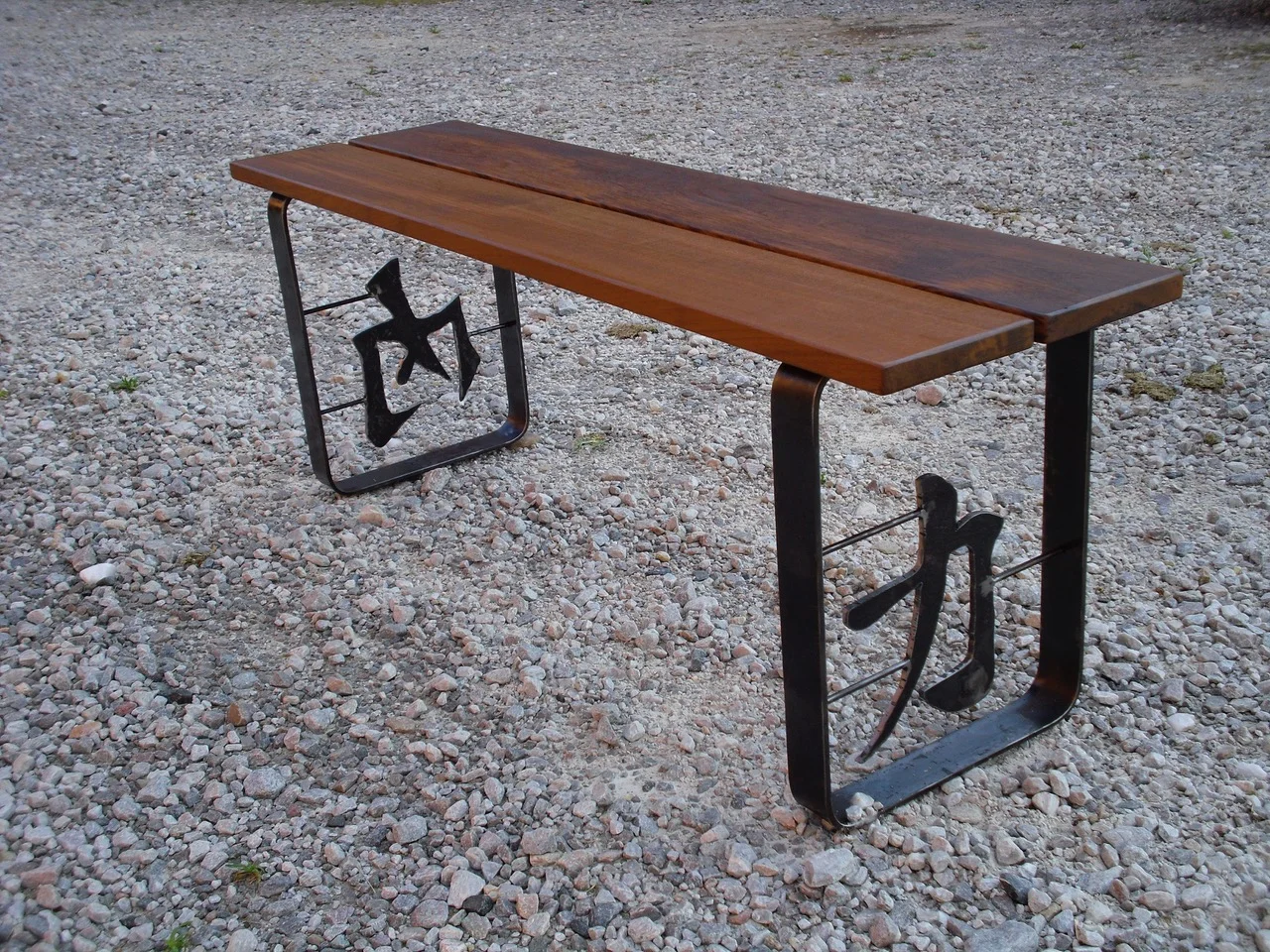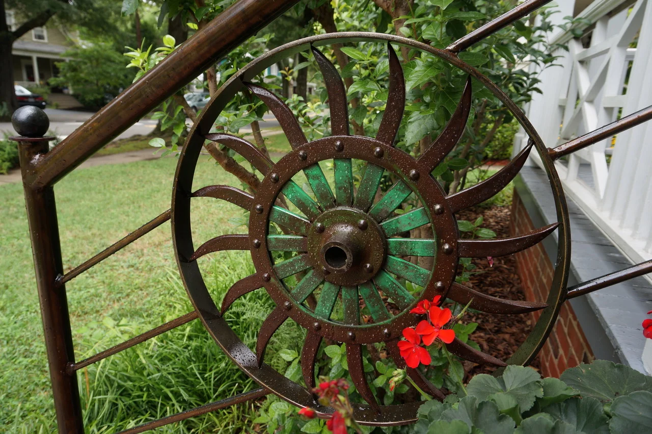 This two part handrail, in North Carolina’s Durham Central Park uses salvaged wheels of boilers in a decorative pattern. This work epitomizes how my outdoor art combines form and function.