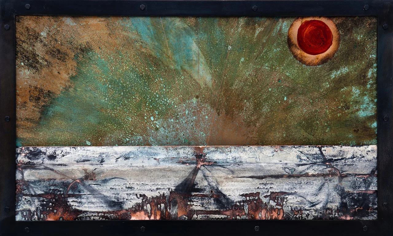 Using copper or brass as my canvas, these are a few examples of my paintings and wall hangings. You will see a great variety in size, color, and expression. The visible steel frames, supporting rods and hooks, and the invisible “floating” wood frames are all personally handmade.